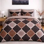 Upgrade your bedroom with the bold and modern appeal of this brown and black geometric double bedsheet set. Featuring an elegant diamond pattern with intricate circular mandala-style designs in earthy tones, this bedsheet adds a sophisticated and contemporary touch to your décor. Crafted from soft and breathable polycotton fabric, it offers lasting comfort, durability, and easy care for everyday use. The set includes one spacious double bedsheet and two perfectly matching pillow covers, creating a coordinated and stylish bedding look. Ideal for modern homes and gifting, this bedding set blends comfort, quality, and timeless design.