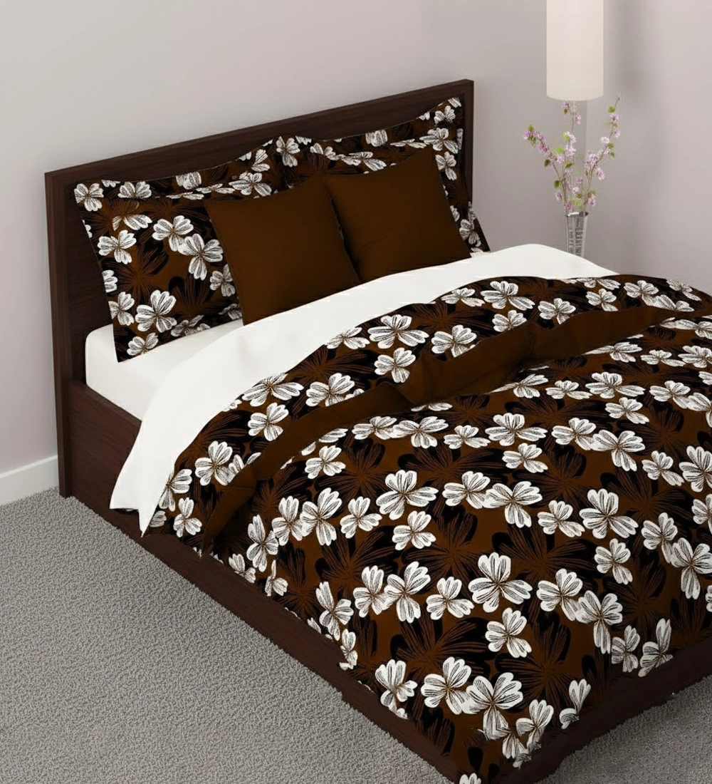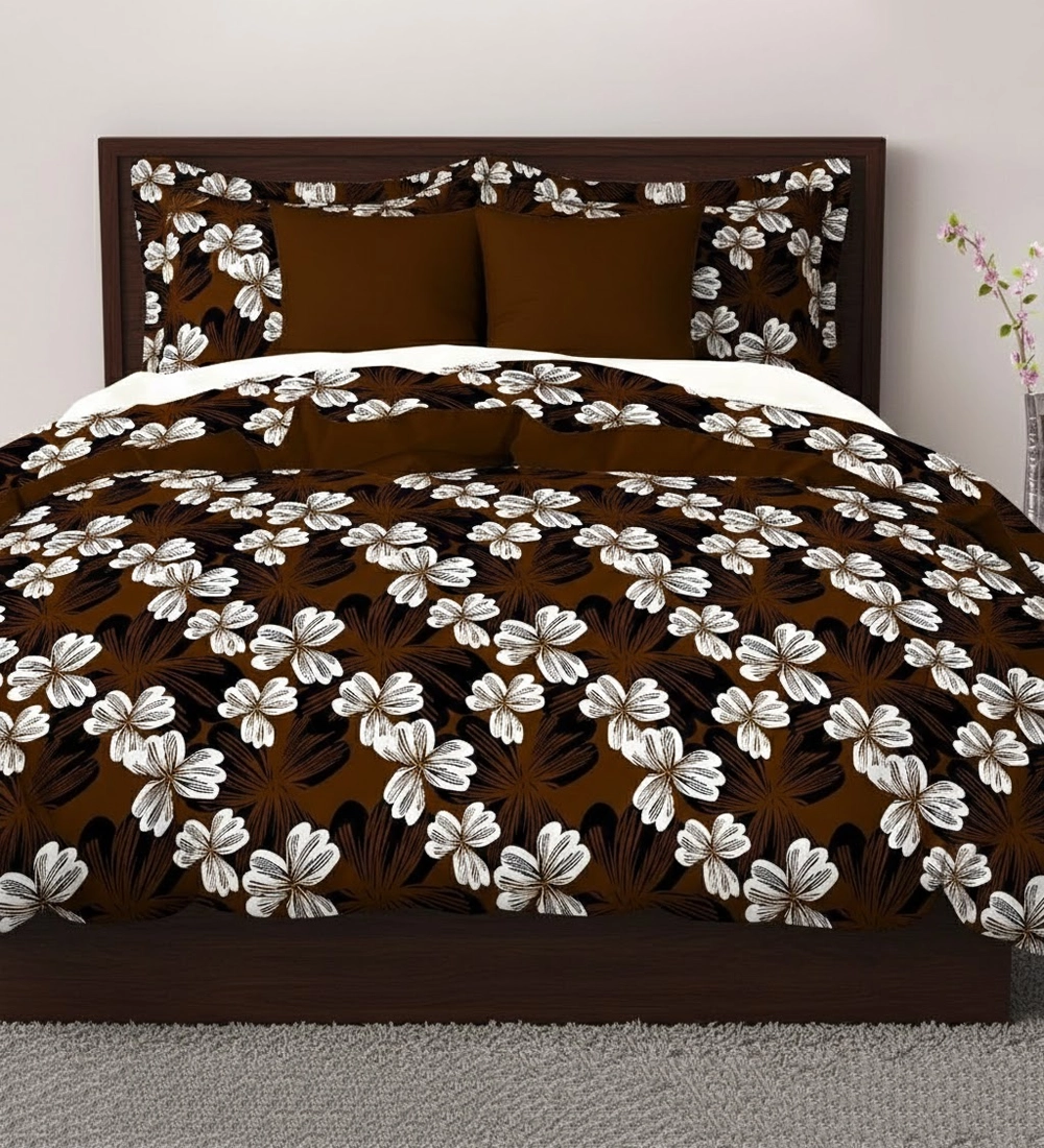Bring a warm and elegant touch to your bedroom with this brown and white floral double bedsheet set. Designed with beautiful white floral patterns on a rich brown base, this bedsheet creates a cozy and sophisticated look for any décor. Made from soft and breathable polycotton fabric, it offers lasting comfort and easy maintenance for everyday use. The set includes one spacious double bedsheet and two perfectly matching pillow covers, giving your bed a neat and coordinated appearance. Ideal for modern homes and thoughtful gifting, this bedsheet set blends durability, comfort, and timeless floral charm.