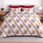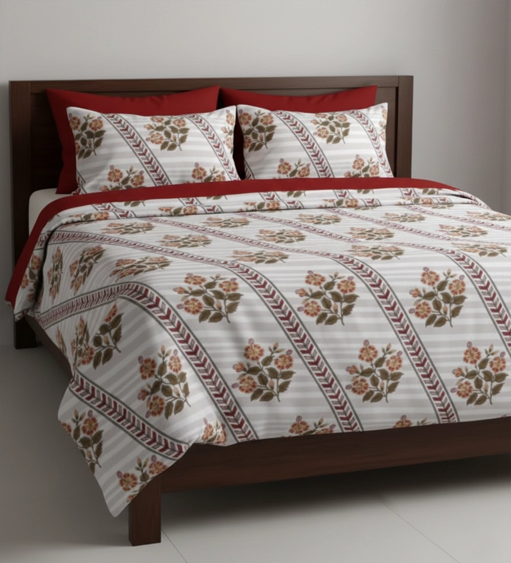 Add a warm and classic touch to your bedroom with this cream and red floral stripe double bedsheet set. Designed with elegant floral motifs and stylish diagonal stripe patterns, this bedsheet brings a perfect balance of tradition and modern style. Crafted from soft and breathable polycotton fabric, it offers lasting comfort, durability, and easy care for everyday use. The set includes one spacious double bedsheet and two perfectly matching pillow covers, giving your bed a coordinated and refined look. Ideal for daily use or gifting, this bedsheet set combines beauty, comfort, and long-lasting quality.