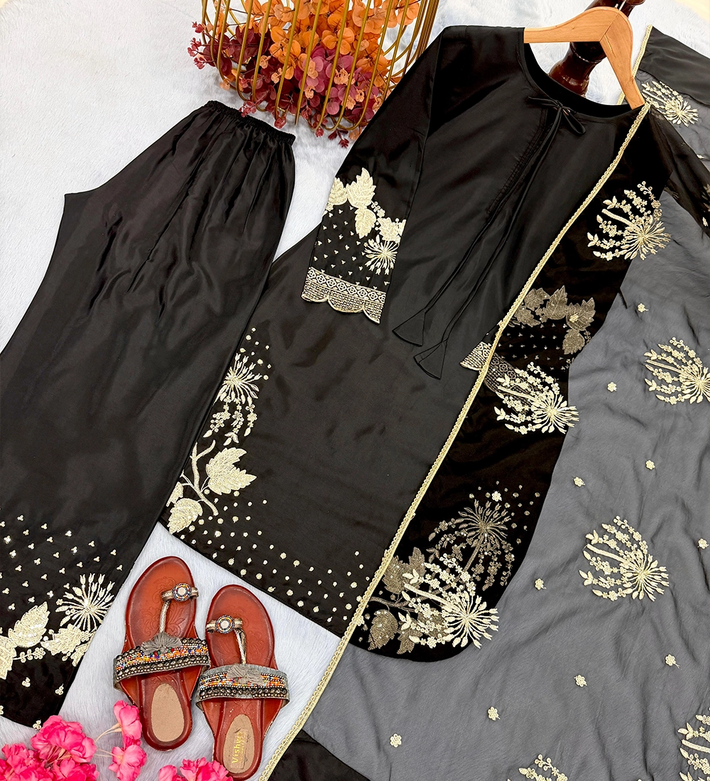 Designer Party Wear Pure Natural Crepe Top Palazzo Set with Organza Silk Dupatta – Embroidered Sequence Work