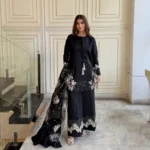 Be the first to review “Designer Party Wear Pure Natural Crepe Top Palazzo Set with Organza Silk Dupatta – Embroidered Sequence Work” Cancel reply