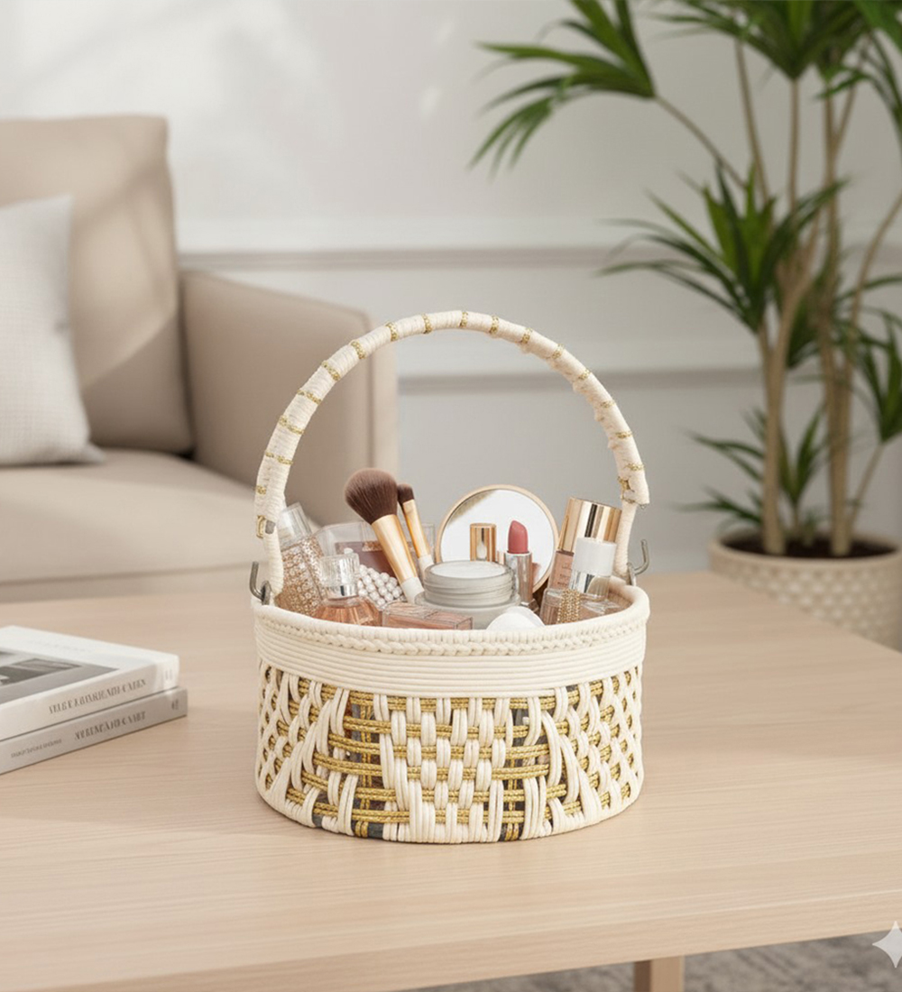 The basket’s durable construction, reinforced rim, and tightly bound cords ensure lasting shape and support, while the compact yet roomy interior provides ample space for everyday items. A comfortable woven handle allows easy portability, making it simple to move from vanity to bathroom or living area. Handcrafted with care, this versatile piece adds warmth, sophistication, and artisanal charm to any space.