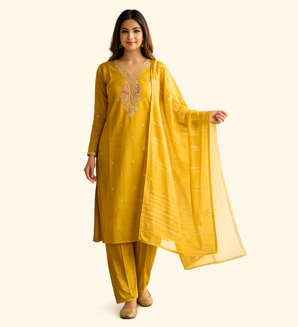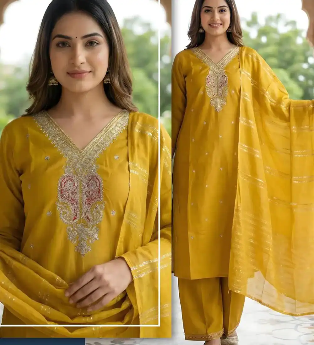 Complete Ethnic Set: Comes with a straight-fit kurta, matching pants, and a lightweight dupatta.