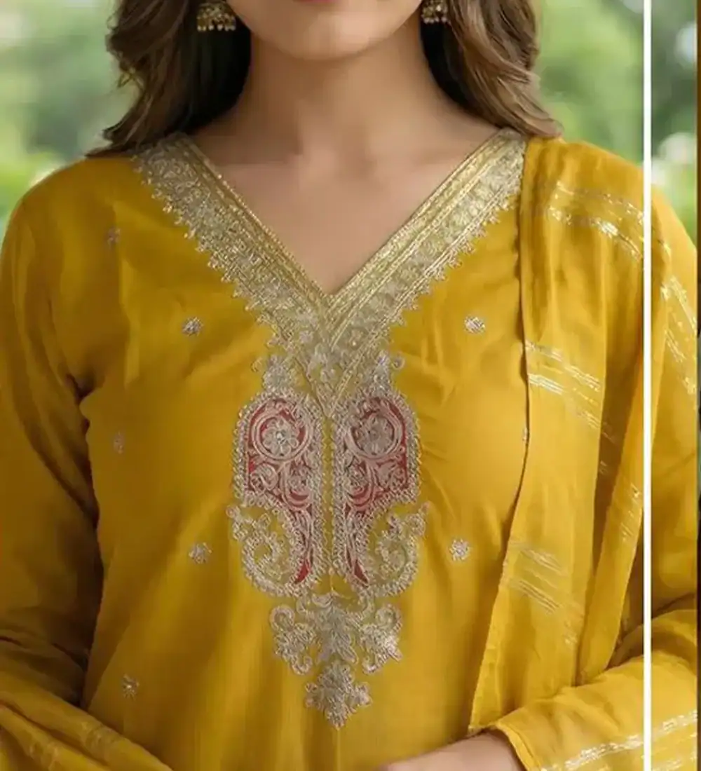 Elegant Embroidered Neckline: Intricate traditional embroidery on the V-neck adds a rich ethnic appeal.