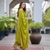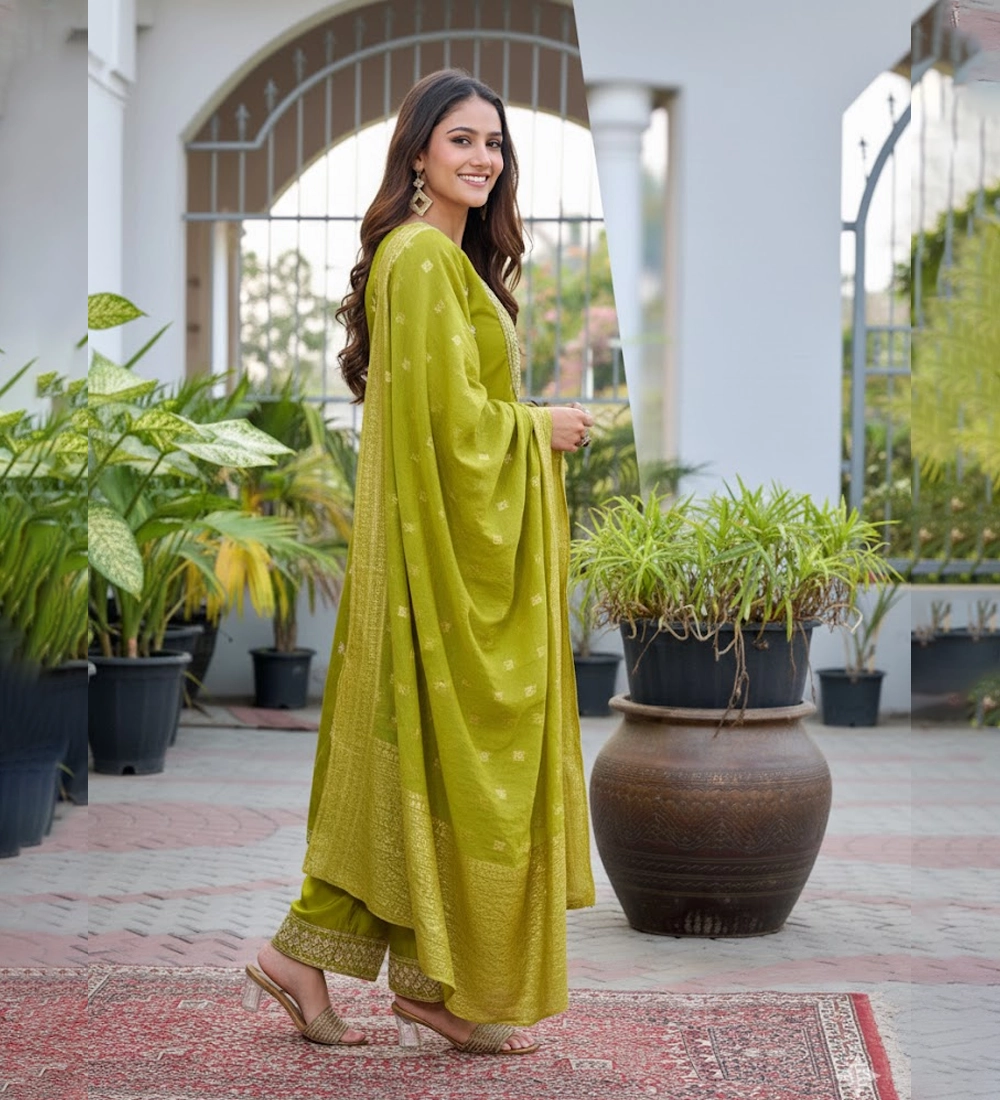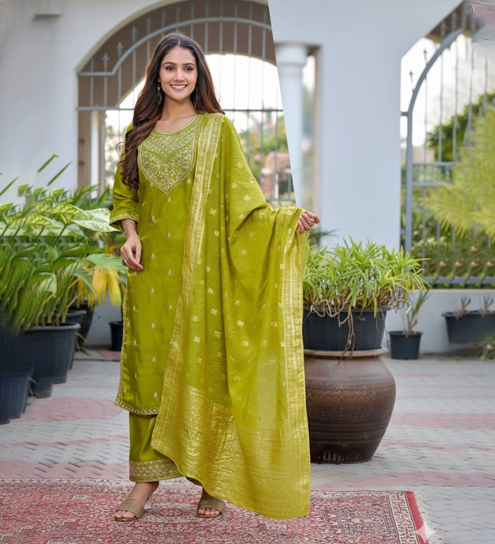 This elegant olive green Roman Glass suit set is designed to bring timeless grace to your festive wardrobe. Crafted from premium Roman Glass fabric, the kurta offers a soft texture with a subtle sheen that enhances its rich and sophisticated appeal. The beautifully embroidered neckline adds a refined traditional touch, making it perfect for celebrations and special occasions. It is paired with a luxurious Banarasi dupatta featuring intricate woven detailing and a graceful border that elevates the overall look. Ideal for festive gatherings, wedding functions, and party wear, this stylish ensemble ensures both comfort and elegance. Available in sizes M to 3XL, it is tailored to provide a flattering fit for every body type.