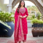 Make a bold and elegant statement with this stunning rani pink Roman Glass suit set, crafted to bring timeless charm to your festive and wedding wardrobe. Made from premium Roman Glass fabric, the kurta offers a smooth texture with a subtle sheen that enhances its rich and luxurious appeal. The intricately embroidered neckline adds traditional sophistication, while delicate buti work throughout the outfit elevates its festive look. Paired with a beautifully woven Banarasi dupatta featuring detailed zari patterns and a decorative border, this ensemble perfectly blends grace and grandeur. Completed with matching straight pants, this outfit is ideal for wedding functions, festive celebrations, and party wear occasions. Available in sizes M to 3XL, it ensures both comfort and a flattering fit for every body type.