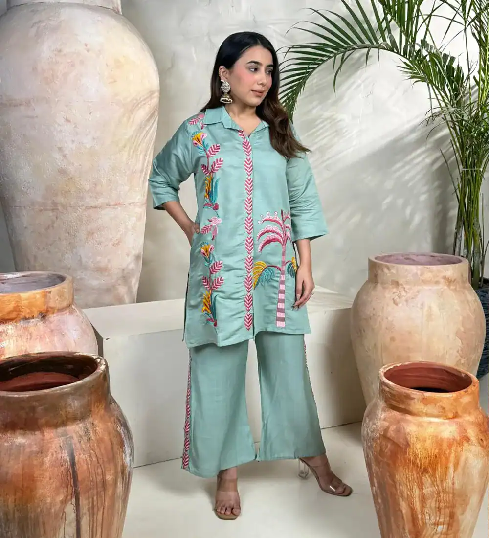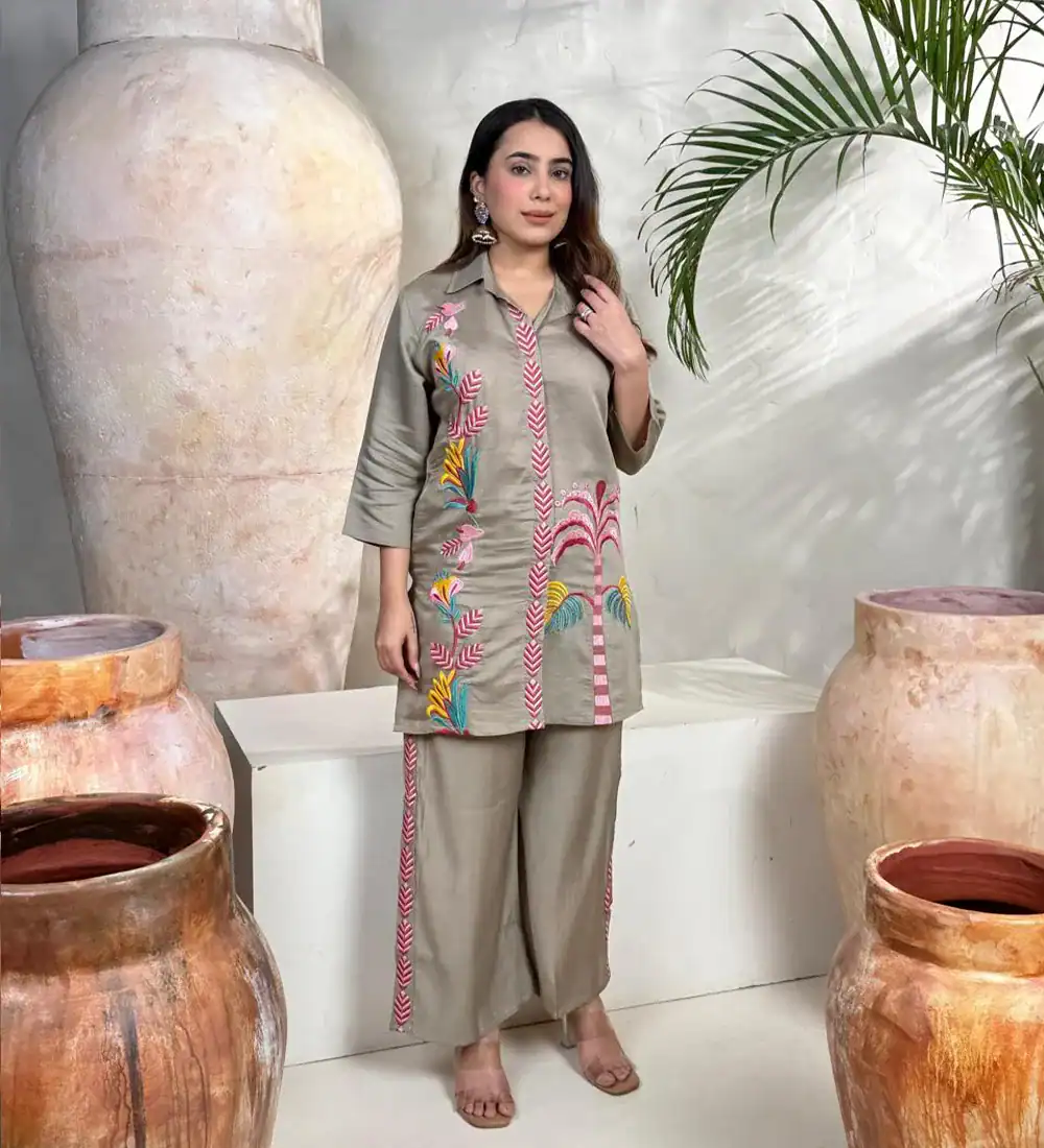 Rayon A-Line Cord Set with Work – Kurti & Pant