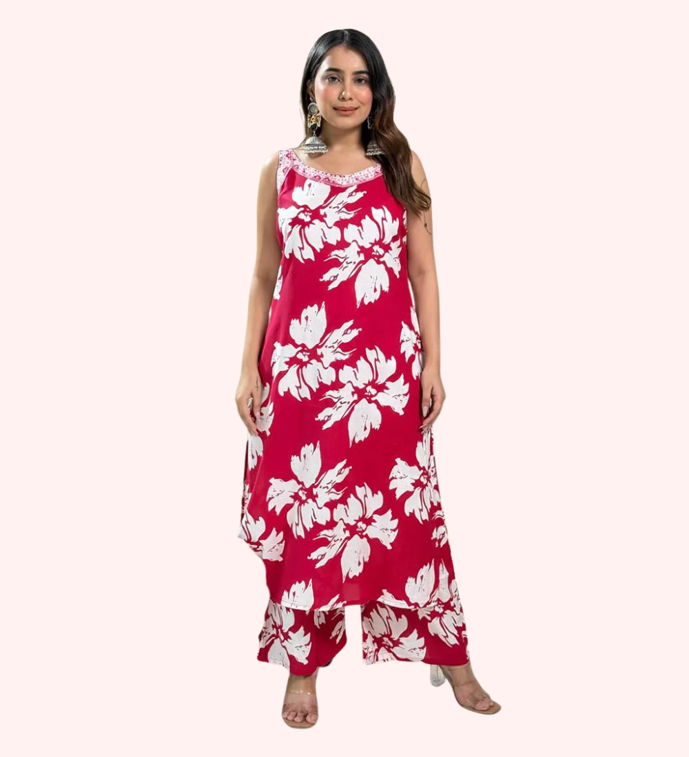 Rayon A-Line Printed Cord Set with Work – Red Floral