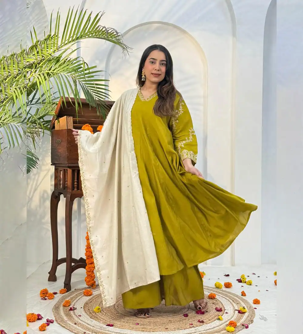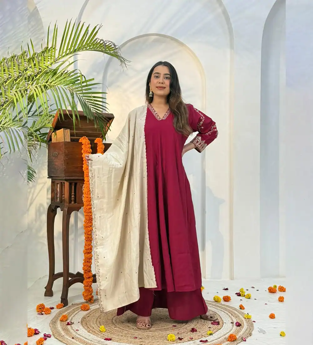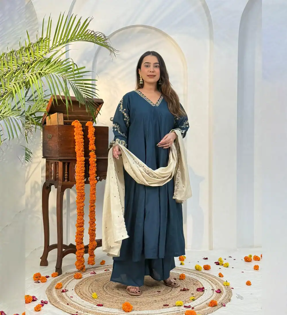The ensemble is completed with a matching dupatta adorned with subtle work, adding a refined finishing touch. Available in sizes M to XXL, this versatile suit set is ideal for festive gatherings, family functions, casual celebrations, and elegant day wear, making it a timeless addition to your ethnic collection.