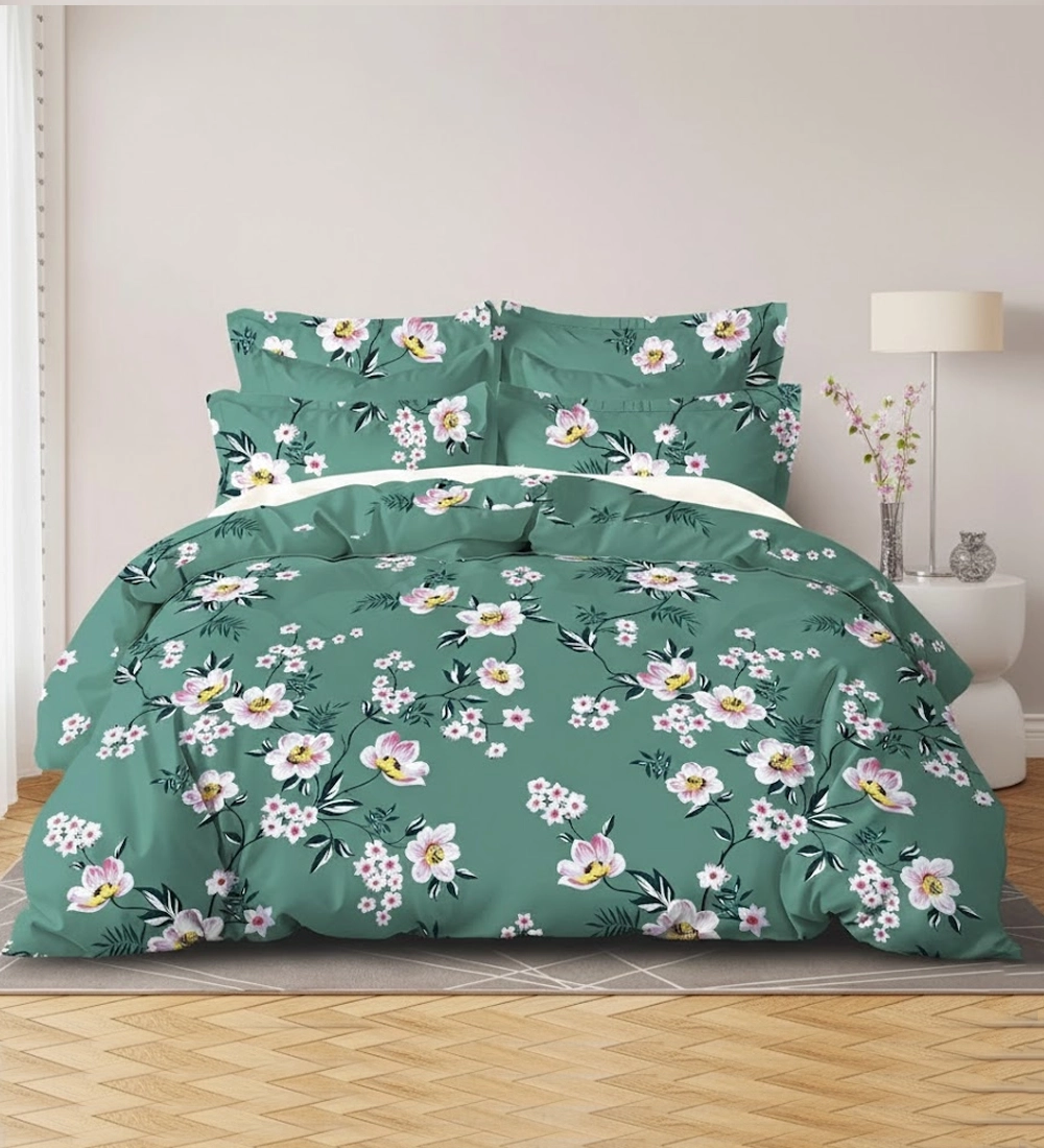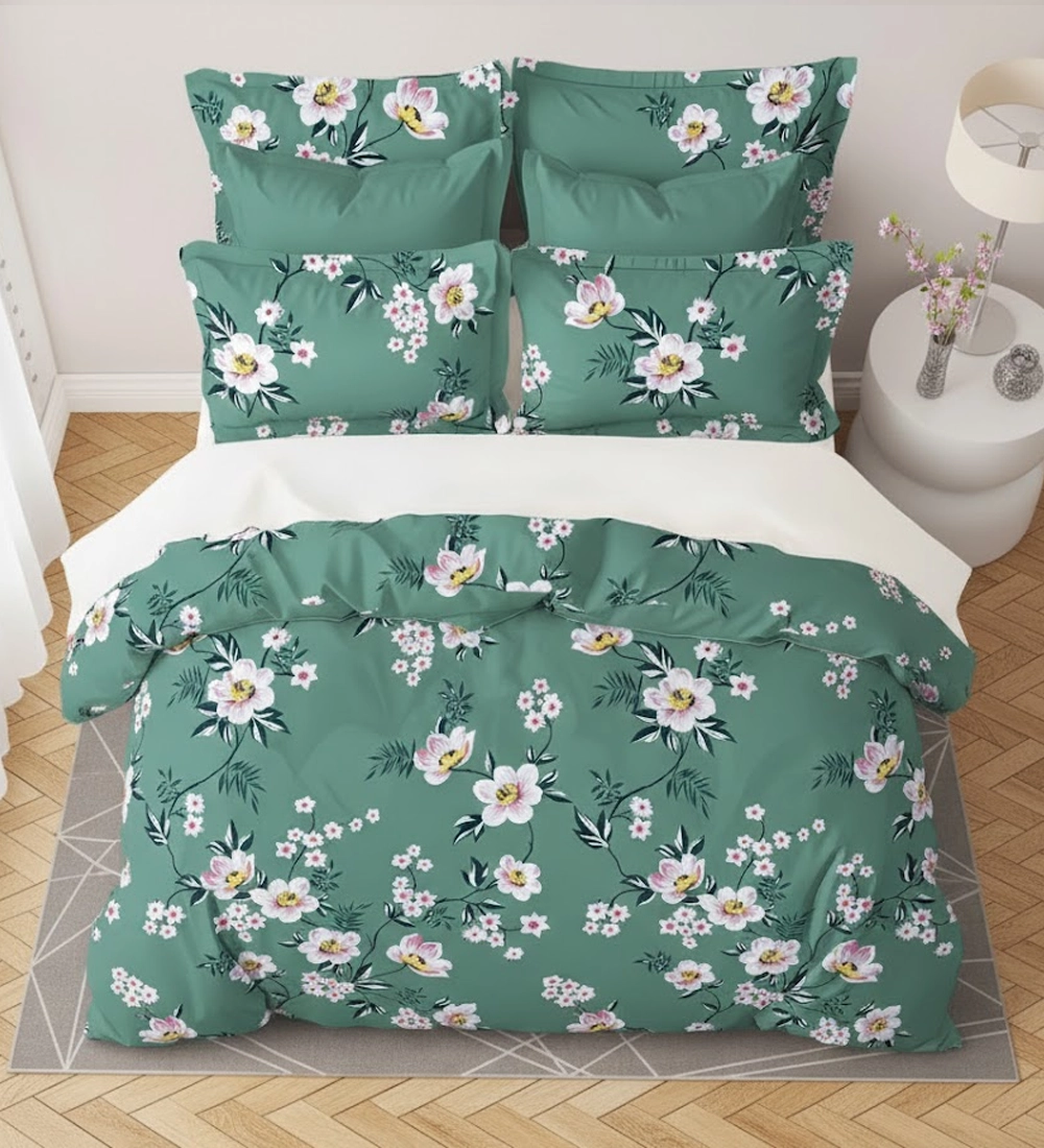 Bring a refreshing and elegant vibe to your bedroom with this sage green floral double bedsheet set. Designed with soft pink and white flowers accented by delicate green leaves on a soothing sage green base, this bedsheet creates a calm and nature-inspired atmosphere. Made from soft and breathable polycotton fabric, it ensures lasting comfort and easy maintenance for everyday use. The set includes one generously sized double bedsheet and two perfectly matching pillow covers, giving your bed a neat and coordinated look. Ideal for modern homes and gifting, this bedsheet set blends durability, comfort, and timeless floral charm.