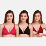 Upgrade your daily essentials with this stylish set of three women’s cotton bras, featuring a versatile mix of red, black, and maroon shades for every mood and outfit. Crafted from soft, breathable cotton fabric, these bras provide a smooth, flattering fit while keeping you comfortable and fresh throughout the day.